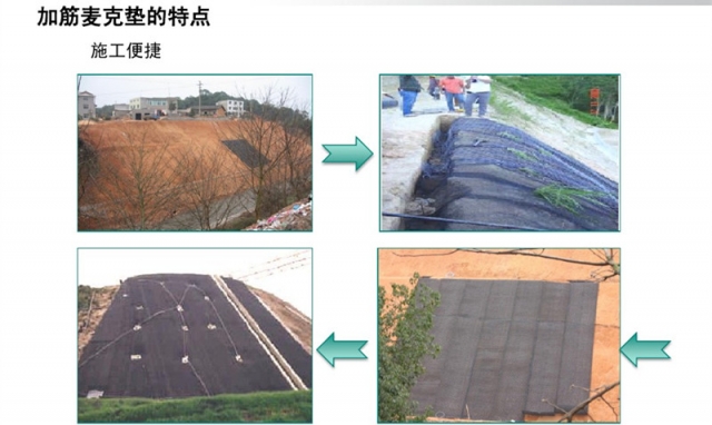 施工方便:加筋麥克墊可按設(shè)計意圖,工廠化生產(chǎn)制作出半成品,施工現(xiàn)場則按設(shè)計圖進(jìn)行組裝定型,操作簡便、受氣候干擾小,且適宜于機(jī)械化操作,既可保證施工質(zhì)量又可加快工程進(jìn)度。