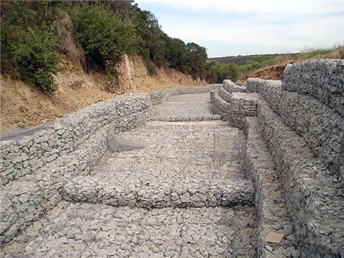 4.較簡(jiǎn)便的施工方法:工藝可按設(shè)計(jì)意圖,工廠化生產(chǎn)制作出半成品,施工現(xiàn)場(chǎng)則按設(shè)計(jì)圖進(jìn)行組裝定型,再鋪設(shè)在整理好的土坡上或開挖好的基坑上,鋪成護(hù)坡或砌壘成箱籠擋土墻,灌進(jìn)填充料、加上蓋網(wǎng)即成