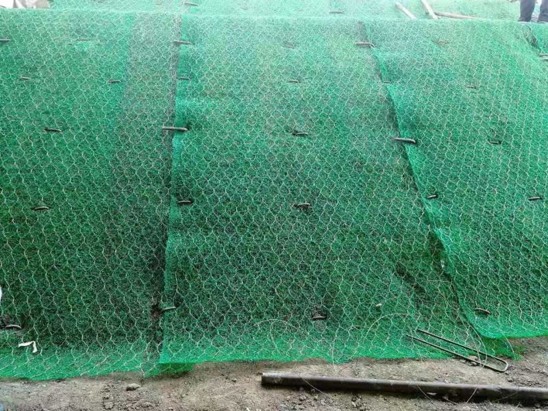 加筋麥克墊平鋪固定在坡面上后,草籽撒播于網(wǎng)的空腔內(nèi),草籽和有機土受到六角形雙絞合金屬網(wǎng)的保護不受沖刷損失,還可適當保持水分易于草籽發(fā)芽,必要時還可人工灑水,保持草的生長條件,一個雨季即可使草茂密生長。選擇根系發(fā)的草種,植被根系穿過加筋麥克墊后能對坡面淺表層土起到加筋作用,同時加筋麥克墊能夠對植被根系起到的加筋作用,將坡面植被及受植被根系影響的淺表層土體連成整體,加筋麥克墊強度高(35KN/m)的特點也確保達了這種整體性,從而能夠增強坡面淺表層土體的整體穩(wěn)定。加筋麥克墊的孔隙性結構能夠消減雨水勢能,防止對坡面造成沖刷。