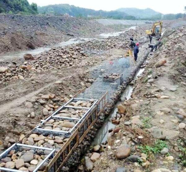 7、在石籠網(wǎng)內(nèi)填卵石時,外露面應(yīng)用粒徑不小于10 cm的卵石,并用人工擺砌平整,以獲得美觀的表面和防止水流將卵石從網(wǎng)目淘走。應(yīng)保證超填石料2. 5~3 cm高,以便為沉陷留有余地。