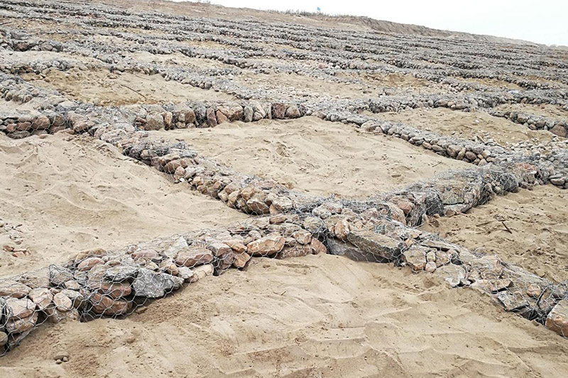 雷諾護(hù)墊箱是用鋼絲通過(guò)專用設(shè)備生產(chǎn)而成。在編織工藝中采用的是雙絞合六邊形金屬網(wǎng)格,因?yàn)椴捎昧诉@種特殊的編織方式,單個(gè)網(wǎng)格在發(fā)生破損時(shí),都不會(huì)引發(fā)相鄰的網(wǎng)格的破損。
