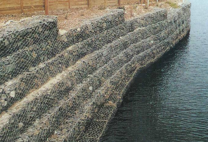 格賓石籠網(wǎng)是由高抗腐蝕、高強度、具有延展性的低碳鋼絲或者包覆PVC的以上鋼絲使用機械編織而成,根據(jù)ASTM A 975和EN10223標準,所使用的低碳鋼絲直徑根據(jù)工程設(shè)計要求而不同。一般介于2.0-4.0mm之間,鋼絲的抗拉強度不少于38kg/m2,金屬鍍層重量一般高于245g/m2石籠網(wǎng)片的邊緣線直徑一般要大于網(wǎng)線直徑。其雙線絞合部分的長度不得小于50mm.以保證絞合部分鋼絲的金屬鍍層和PVC鍍層不受破壞。