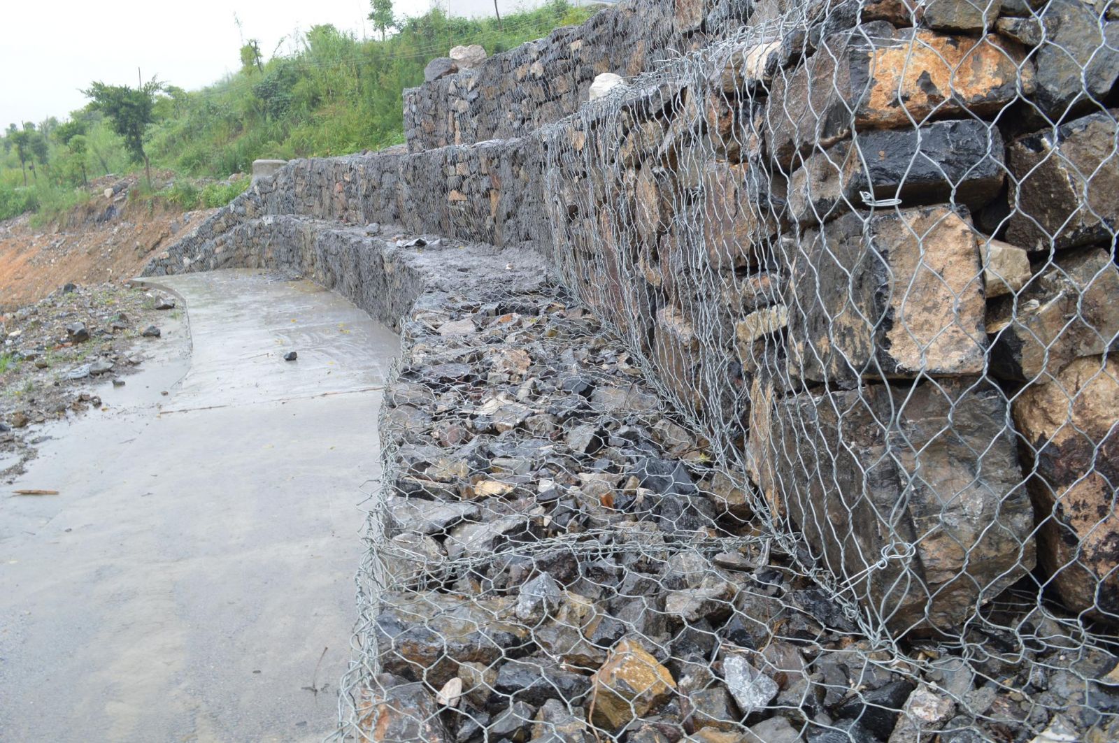 石籠網(wǎng)由高抗腐蝕、高強度、具有延展性的低碳鋼絲或者包覆PVC的以上鋼絲使用機械編織而成,使用該網(wǎng)制作而成的箱型結(jié)構就是石籠。根據(jù)ASTM和EN標準,所使用的低碳鋼絲直徑根據(jù)工程設計要求而不同。一般介于2.0-4.0mm之間,石籠網(wǎng)鋼絲的抗拉強度不少于38kg/m2,金屬鍍層重量一般高于245g/m2,石籠網(wǎng)片的邊緣線直徑一般要大于網(wǎng)線直徑。其雙線絞合部分的長度不得小于50mm.以保證絞合部分鋼絲的金屬鍍層和PVC鍍層不受破壞。