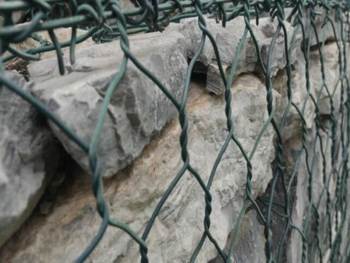 綠格網又稱“格賓網”、“石籠網”,由各種網孔規(guī)格的綠格網片按照ASTMA975-97規(guī)范組裝而成,工程現(xiàn)成填充石料組裝形成柔性的、透水的、整體的支擋結構,常用于生態(tài)防護工程。該結構采用高熱鍍鋅鋼絲或者10%鋅鋁合金鋼絲經過雙線絞合編織而成的,其雙線絞合部分的長度不能低于45mm,以保證絞合部分的防腐性能不被破壞。因為環(huán)境比較惡劣,污染比較嚴重,所以鋼絲的表面涂塑(包PVC或者PE)增強鋼絲的抗腐蝕性能。